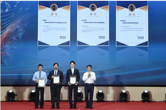 市委常委、宣传部部长李秋峰为无锡交响乐团核心成员颁发聘书。聘请林大叶担任无锡交响乐团艺术总监、首席指挥,聘请尹锋担任无锡交响乐团常务副团长,聘请李劭晟担任无锡交响乐团音乐指导。