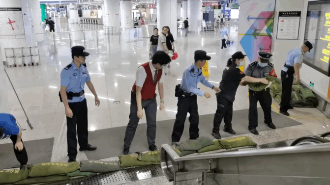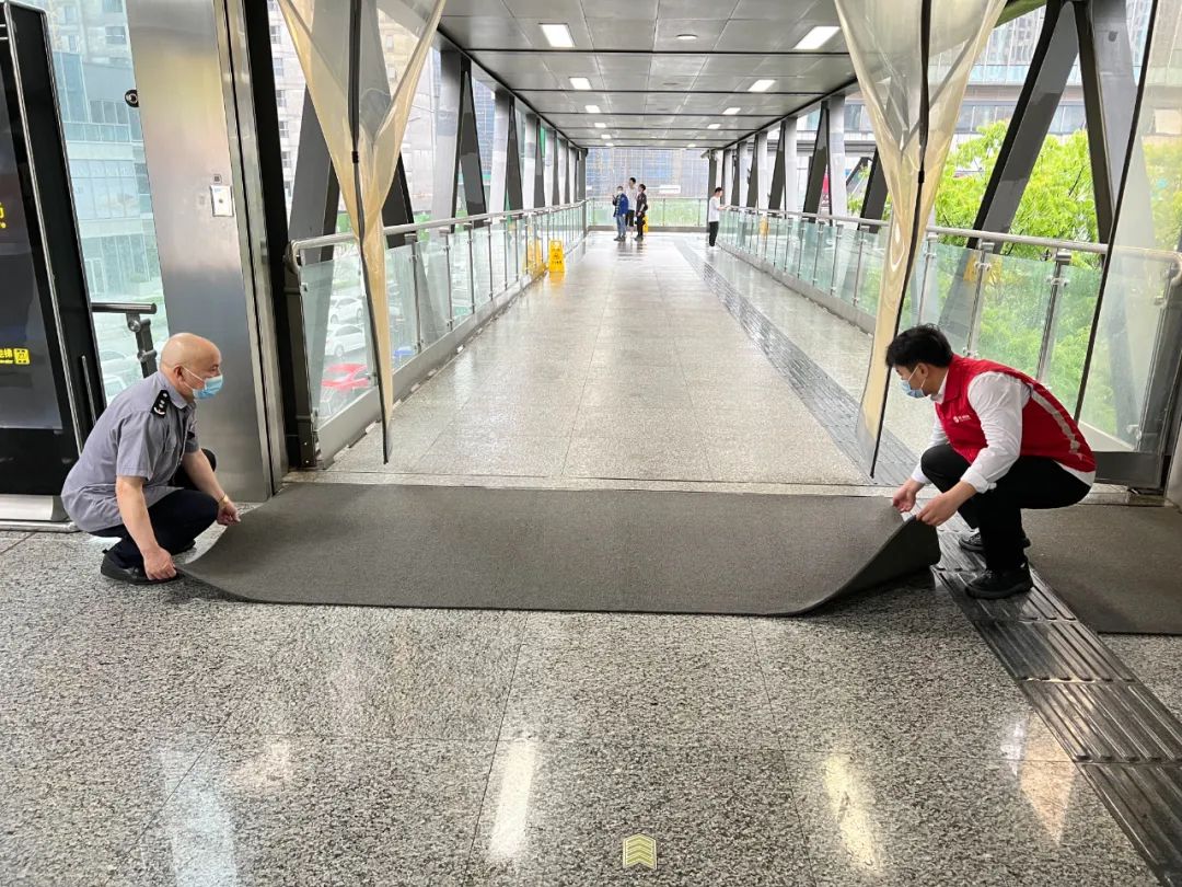 ▲交通治安分局各站点派出所联合地铁站区工作人员对防汛物资逐一核对检查,第一时间打开消防排水井、铺设防滑垫、放置警示牌等措施,全力守护站区安全。