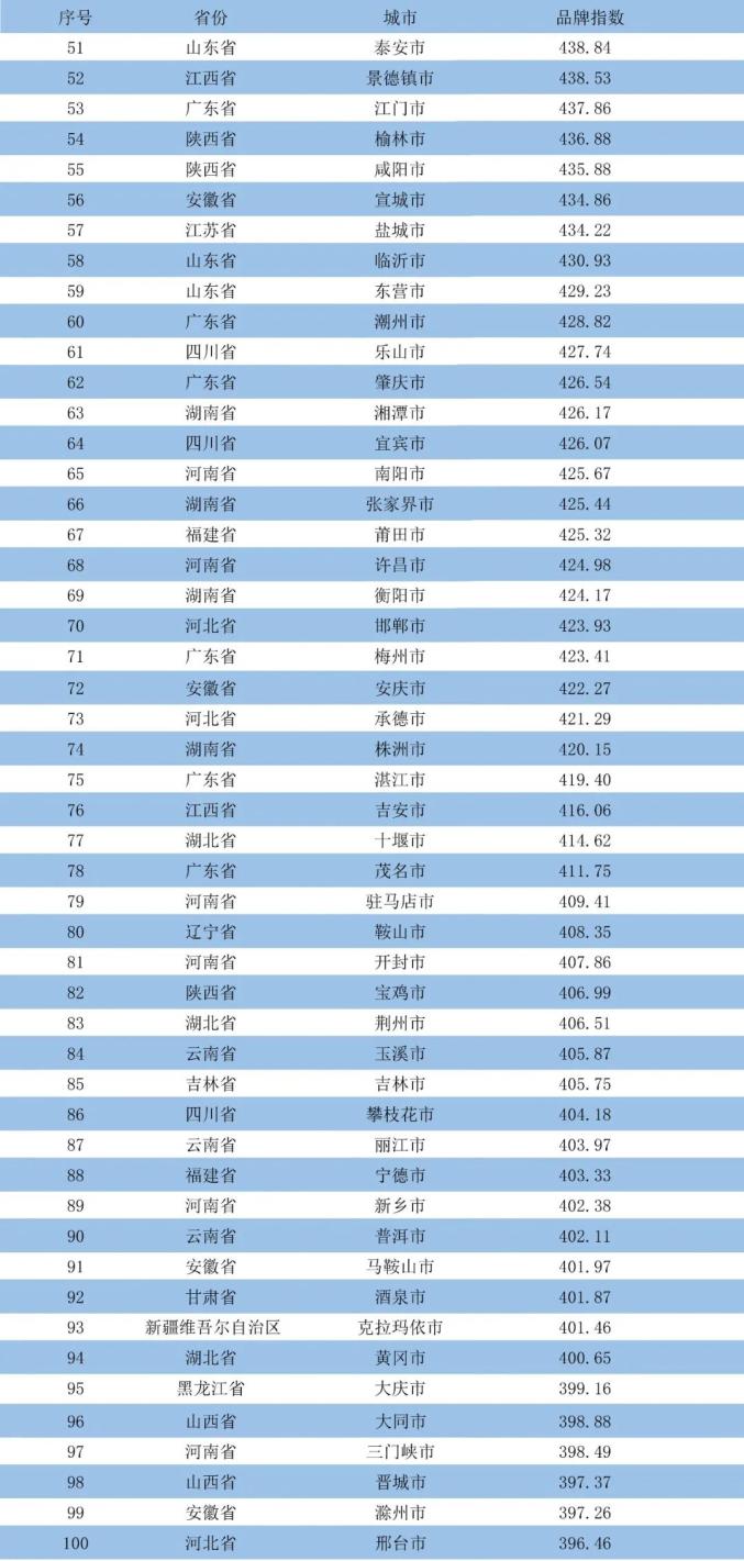中国城市品牌评价项目组、中国城市报社在中国品牌建设促进会、中国报业协会、中国国土经济学会等机构支持下,依据国际标准《品牌评价基础和原则》(ISO20671:2019)和国家标准《品牌评价城市》(GB/T35779-2017),运用近两年的国家统计数据,对全国293个地级市(不含省会以上城市)进行标准化分析,最终计算出各城市品牌综合影响力指数,发布前100名城市名单。