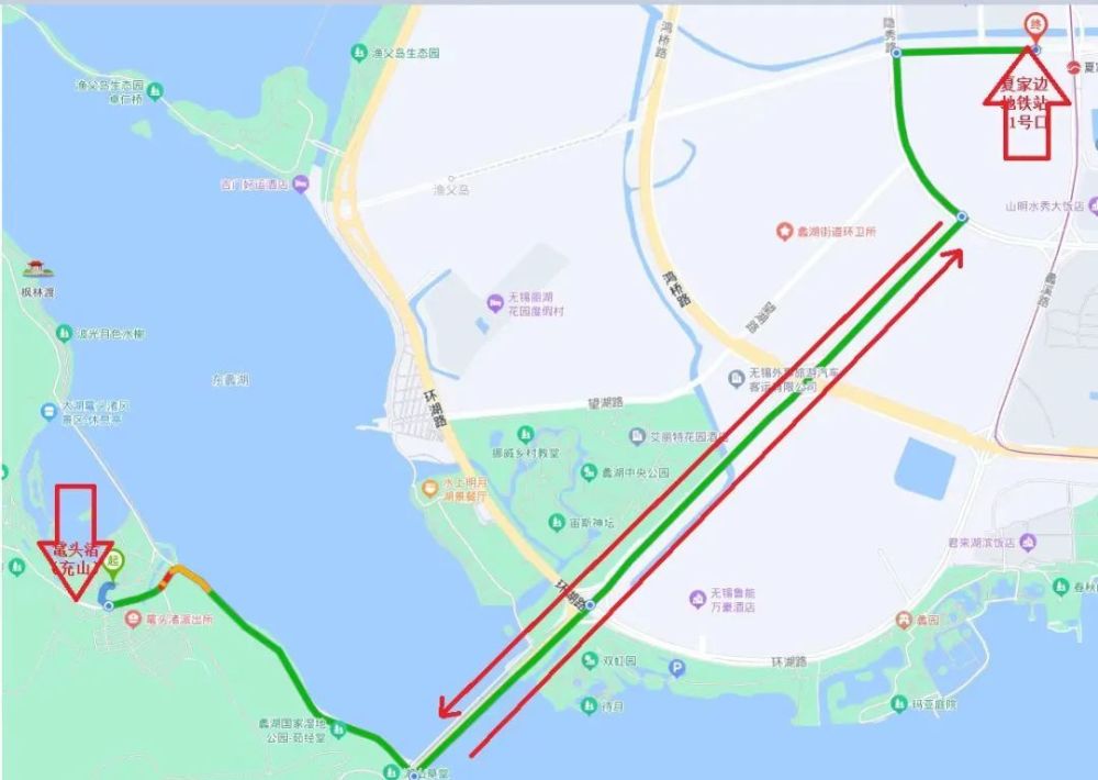 由地铁四号线夏家边站4号口始发,经蠡溪路、隐秀路、双虹路、鼋渚路至鼋头渚景区。