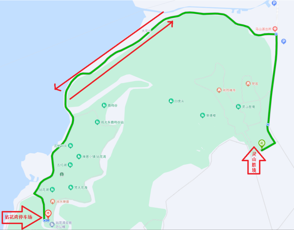 由灵山胜境出发,经群灵路、古竹路、环山西路至拈花湾。