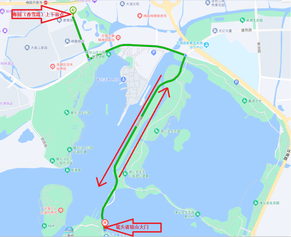 由香雪路梅园站始发,经香雪路、环湖路、建筑路至鼋头渚犊山大门。返程由鼋头渚犊山大门内站点上车,原线返回。